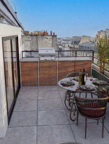 La terrasse est recouverte de dalle travertin et entourée de jardinières sur mesure recouvertes de zellige vert. Elle se compose d'un coin détente avec canapé et table basse et d'un coin repas avec cuisine d'extérieur. Accessible depuis le le 7ème étage par l'escalier et une entrée indépendante de la chambre elle s'installe comme une pièce supplémentaire.
